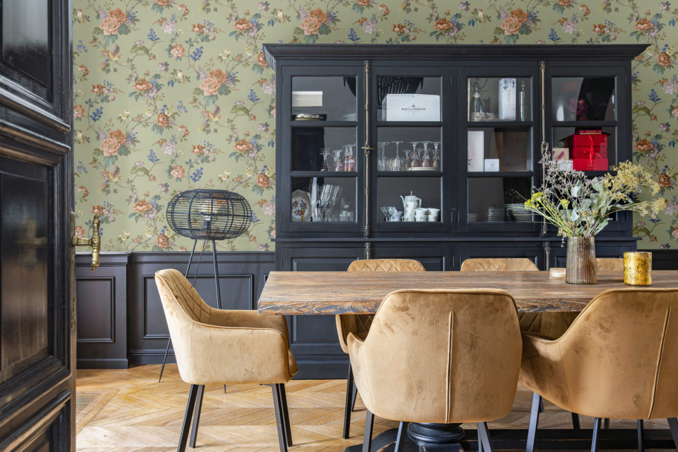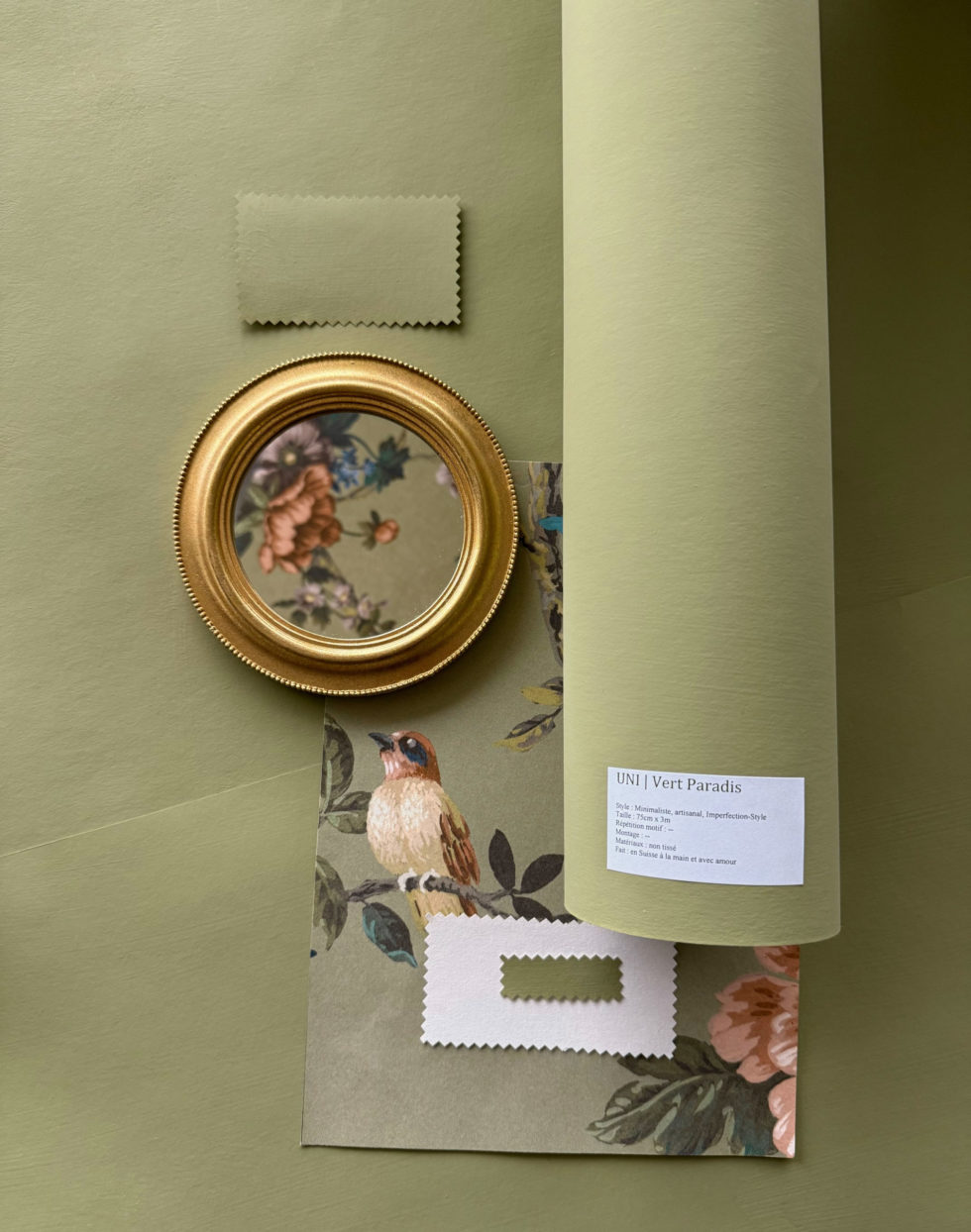 Le design AYA est proposé avec deux fonds : beige et vert naturel. Il se prête aussi bien à une chambre à coucher qu’à un salon ou une salle à manger.