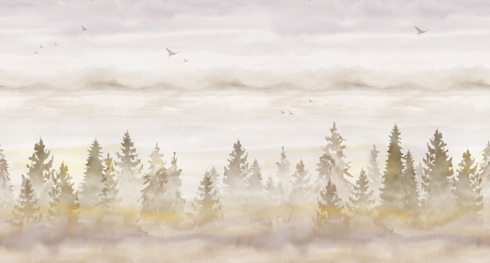 Les touches fluides et transparentes composent un paysage aérien évoquant la liberté et le mouvement — tel un vol d’oiseaux au-dessus des contreforts des forêts d’épicéas alpines.