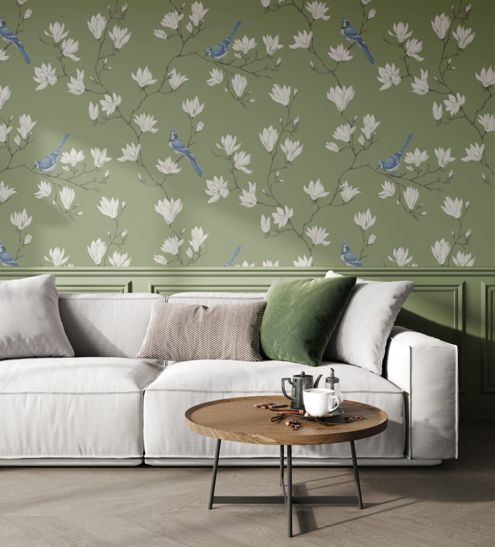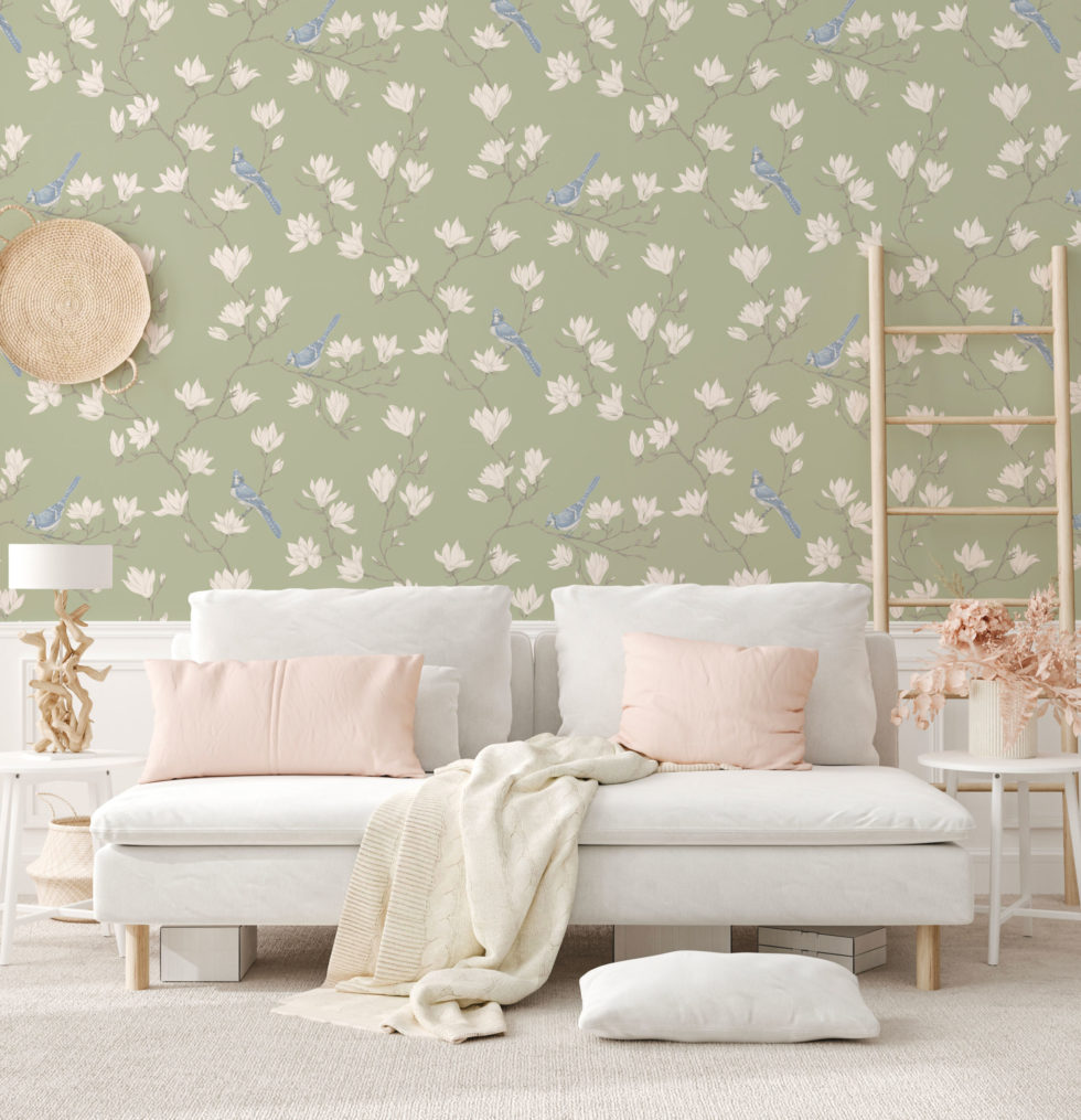 Fresque Magnolia est un motif romantique peint à la main avec de la gouache, représentant des fleurs de magnolia et des oiseaux de geai dans un style Chinoiserie élégant.