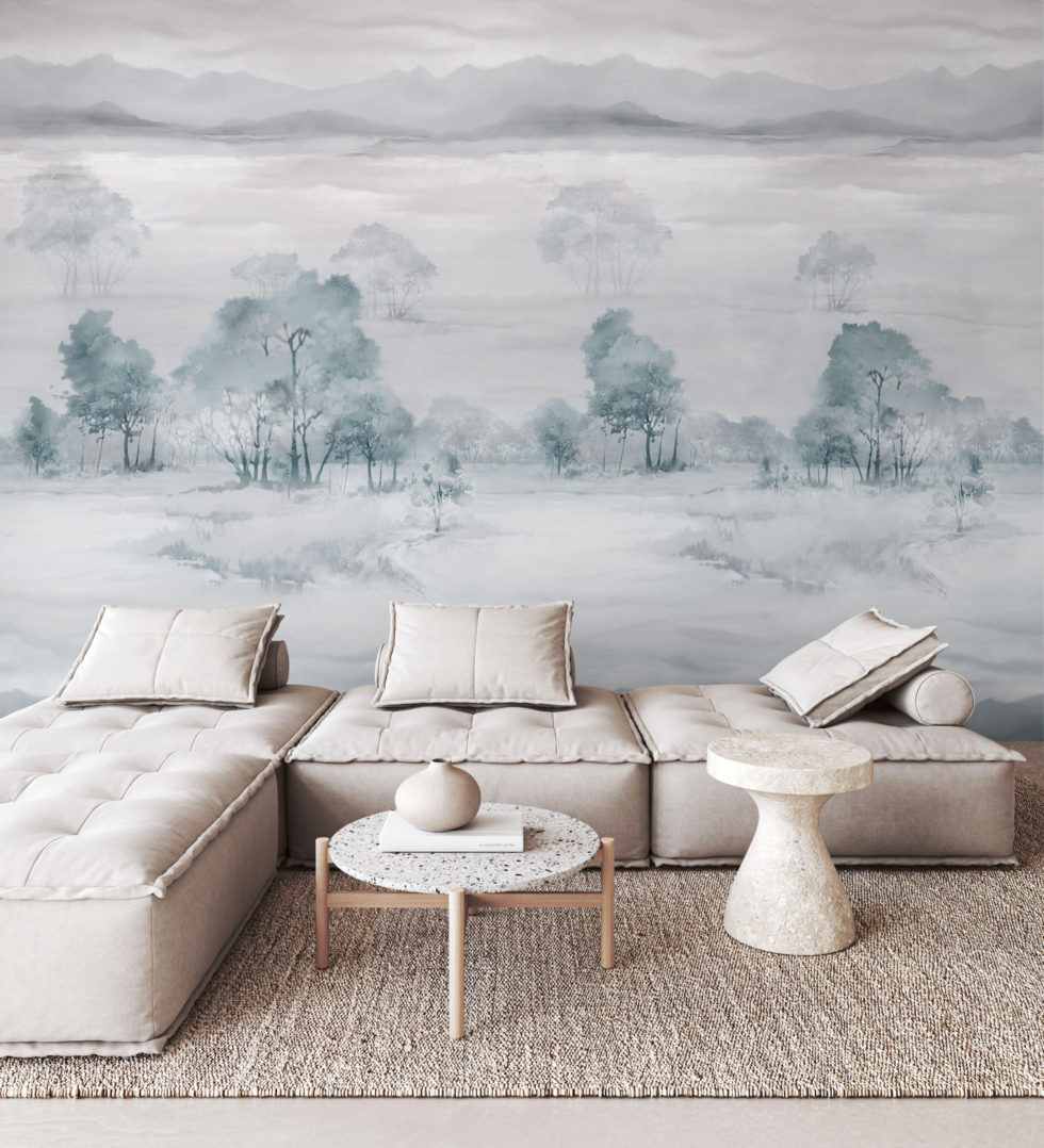 Toscane est un panneau panoramique aérien, romantique et délicat, inspiré de paysages apaisants et de lignes d’horizon douces.