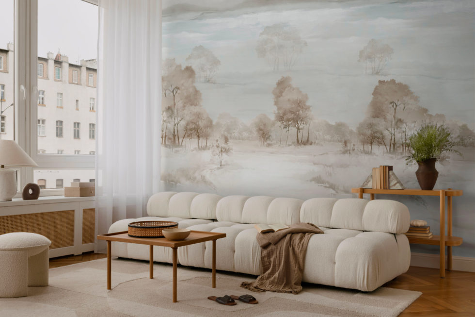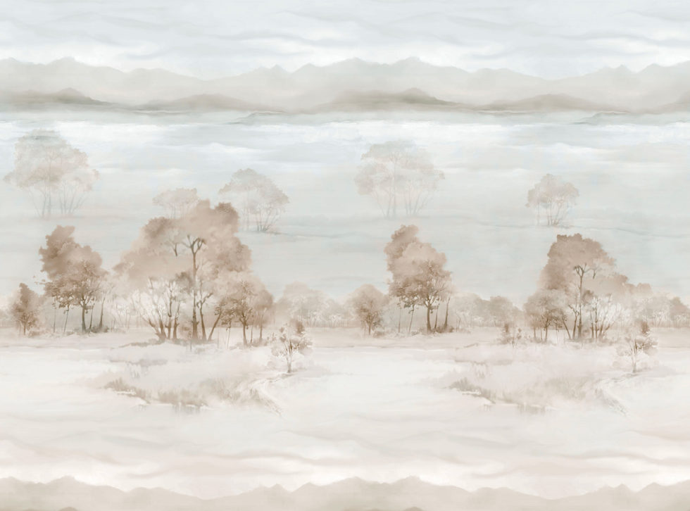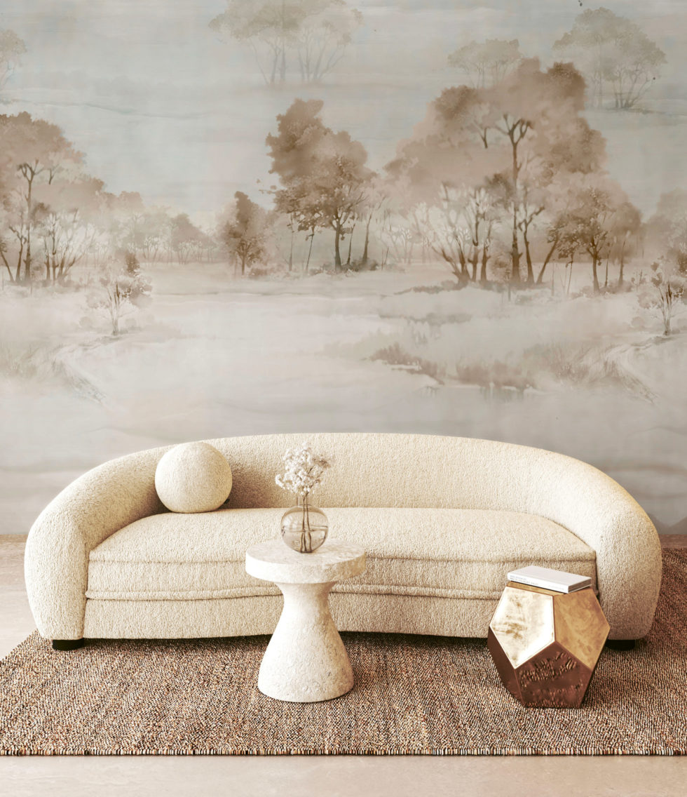 Toscane est un panneau panoramique aérien, romantique et délicat, inspiré de paysages apaisants et de lignes d’horizon douces.