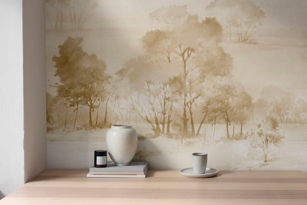 Toscane est un panneau panoramique aérien, romantique et délicat, inspiré de paysages apaisants et de lignes d’horizon douces.
